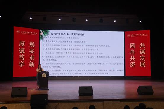 刘雅心老师针对大学生安全教育进行讲解。主要从交通、饮食、消防、反诈等方面结合案例向同学们讲述了身边存在的安全隐患,她要求学生必须充分认识到在日常生活中防患于未然的重要性和生命的脆弱与可贵,时刻铭记“生命重于泰山,安全高于一切”。