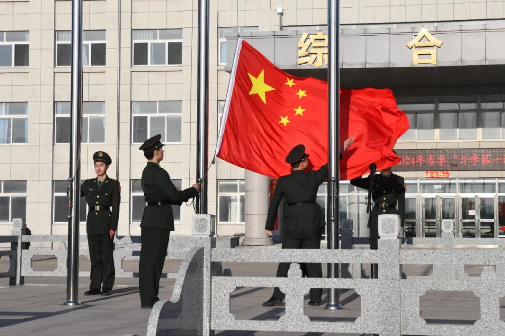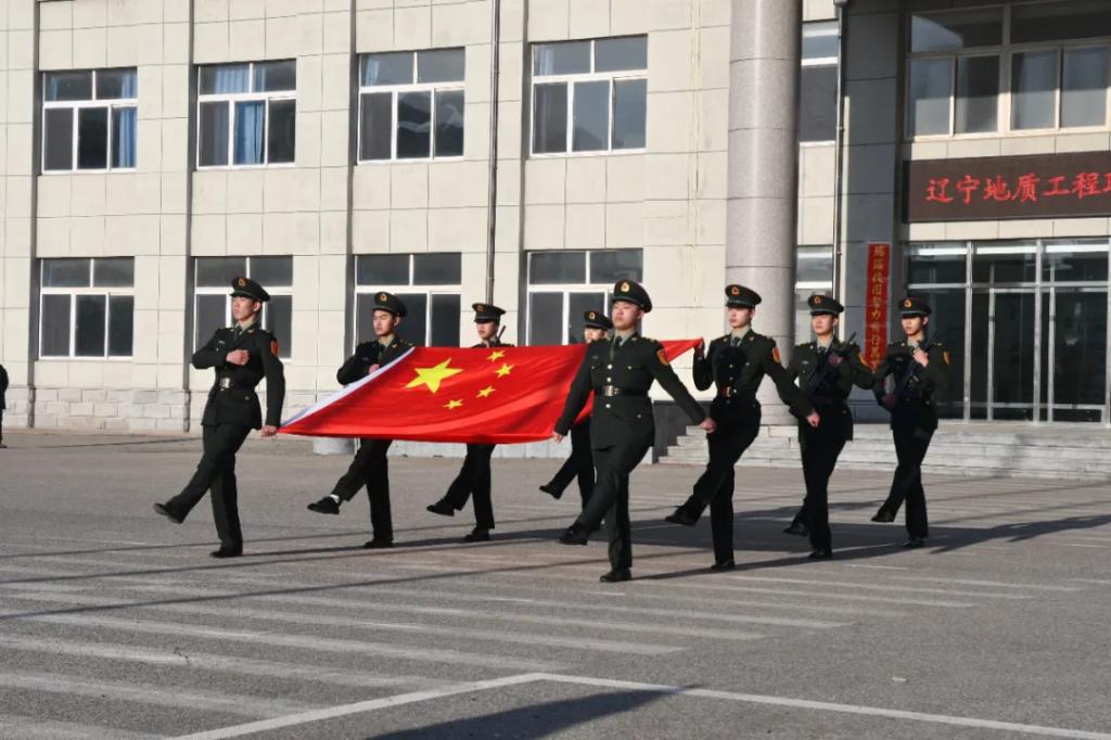 国旗仪仗队迈着整齐划一、铿锵有力的步伐,护送五星红旗走向升旗台,全体师生面向国旗肃立致礼,伴着慷慨激昂的《义勇军进行曲》,五星红旗在晨曦中冉冉升起。
