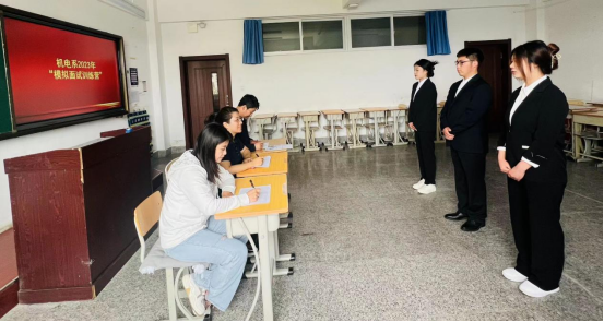 为更好的推进毕业生就业工作,5月18日机电系大学生党支部举办2021级学生“成长面试间”模拟面试训练营系列活动,旨在通过模拟面试训练,提升学生的就业能力。圣凯龙机械有限公司学管总监张辉、圣凯龙机械有限公司学管主任李晓雯、机电系党总支书记孔园园、机电系大学生党支部书记汪冲、各位辅导员担任面试官,为2021级学生提供个性化的面试指导与服务。