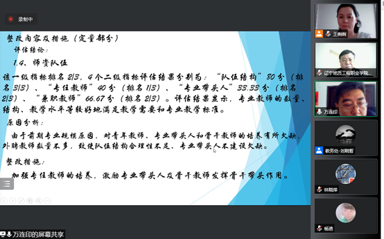 在会上,环生系主任万连印、教学主任林晓萍,分别对《分析检验技术》、《环境工程技术》两个专业的整改方案进行了汇报,其中包括专业评估结论、原因分析及整改措施等内容。