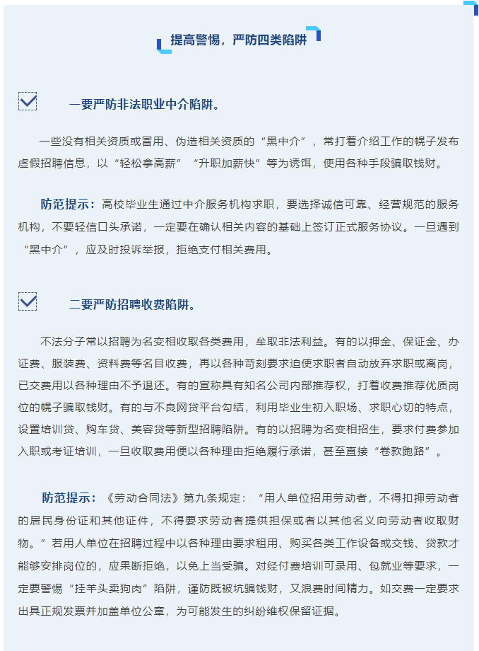 当前,距毕业生离校不足2个月时间,正值高校毕业生求职关键期,一些不法分子打着招聘的幌子挖“坑”设陷,诈骗钱财、盗用信息、诱导犯罪等现象时有发生,严重损害毕业生就业权益。为保护自身安全和合法权益,高校毕业生在求职过程中,一定要增强三个意识,严防四类陷阱。