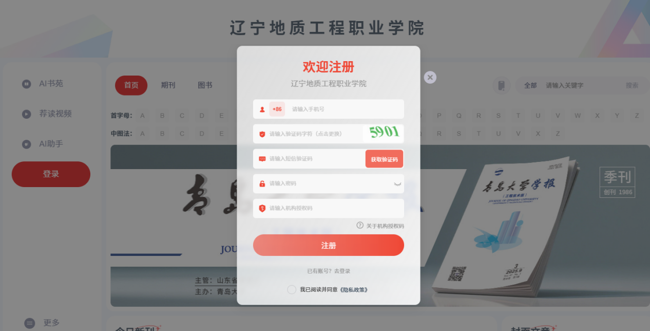 首次使用博看数据库网页版,根据提示先完成注册并填写授权码lndzgc。注册成功后,后续可直接登录使用,校外也能同步访问。