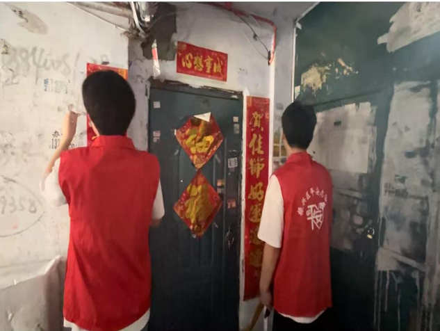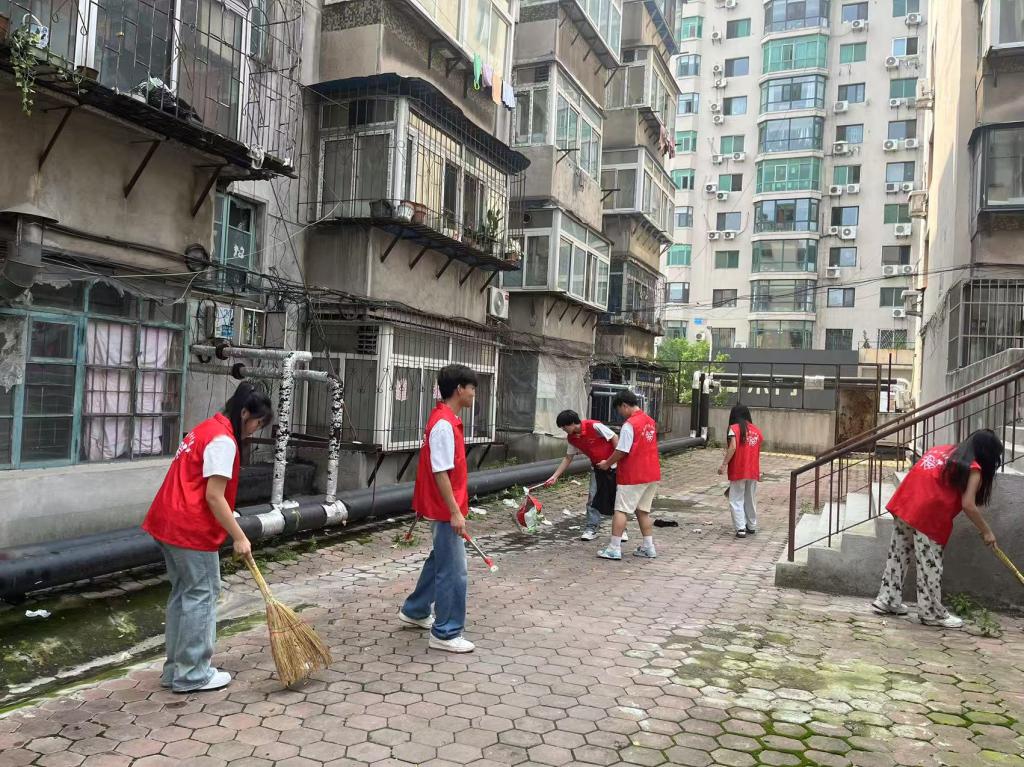 居民楼道口由连婷婷、么子行、孙继逊同学负责。清扫路面落叶、纸屑、烟头,重点清理了前期调研发现的几处卫生死角(堆积的建筑废料边缘、墙角),清除了墙面和电线杆上的小广告(“牛皮癣”)