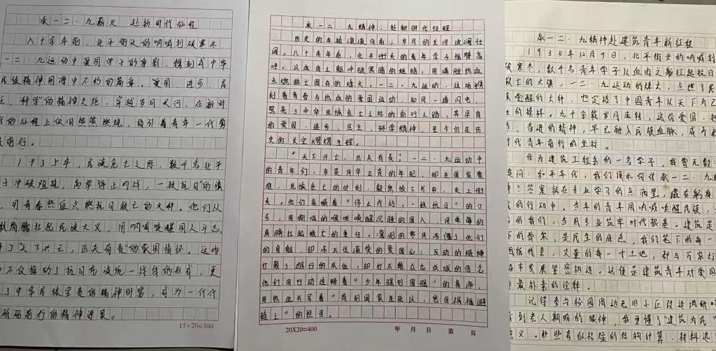 同学们在文字中回望北平学生的呐喊,将“爱国、进步、担当”的精神与建筑专业“筑基立梁”的特质相联结——不少作品提及“以专业所学建强国之基,以青年之肩担时代之责”,让历史精神照进了当代大学生的成长实践,也展现出新时代建工人“有理想、敢担当”的精神风貌,让爱国精神在青年群体中焕发新的时代光彩,也展现出新时代建工人“有理想、敢担当”的精神风貌。