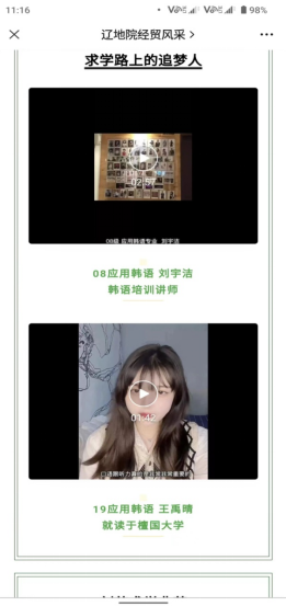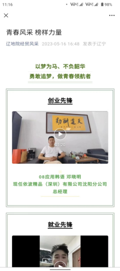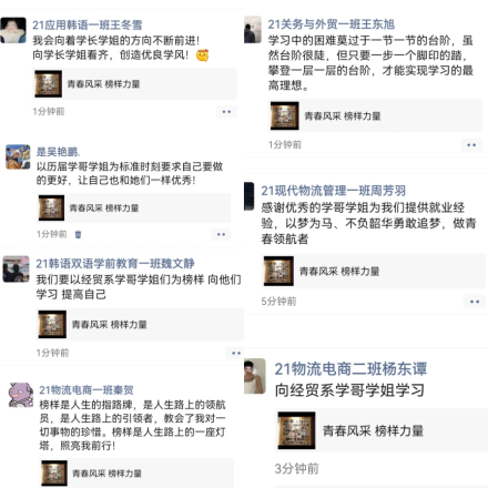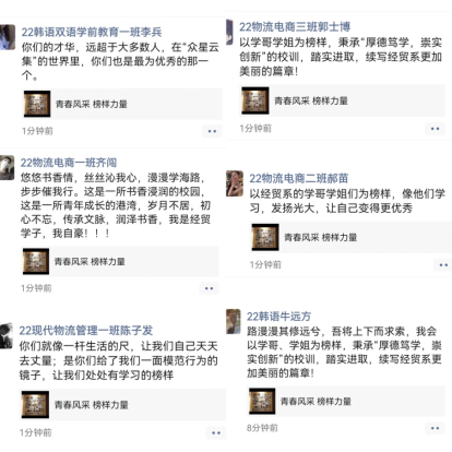为充分发挥优秀毕业生典范作用,给学生指明奋斗的风向标。在职教周期间,经贸系收集往届多名优秀毕业生事例,推送至公众号,并且发送至各班级群中,利用多种媒体渠道,宣传推介优秀毕业生的典型事迹,挖掘他们成才的成功经验,充分发挥优秀毕业生的典型引路作用,激励在校生刻苦学习、自立自强。