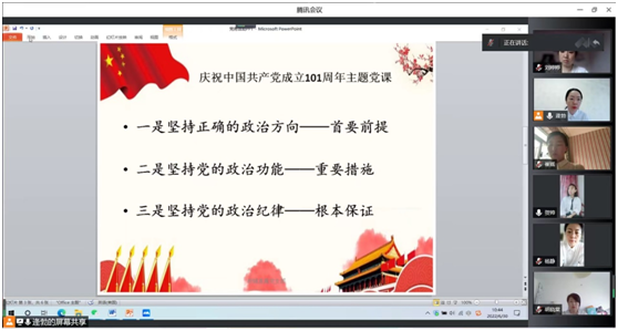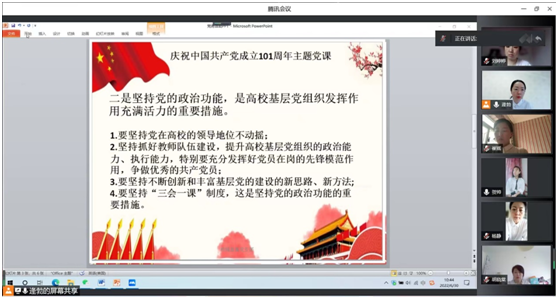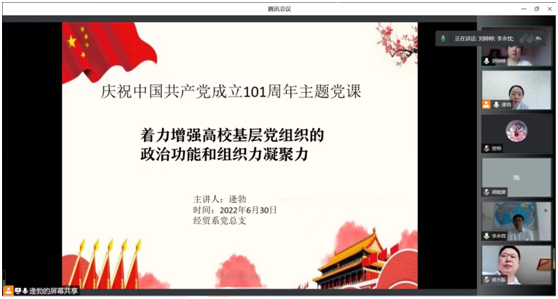 为迎接中国共产党诞辰101周年,6月30日上午,经贸系党总支在线上召开了党员大会。会议主题是由系党总支书记逄勃,为全体党员讲“着力增强高校基层党组织的政治功能和组织力凝聚力”的党课。逄勃从三个方面阐述了如何增强高校基层党组织的政治功能和组织力凝聚力。一是坚持正确的政治方向,是高校基层党组织落实立德树人根本任务的首要前提。立德树人是党赋予高校的根本任务,“要把立德树人的成效作为检验学校一切工作的根本标准,”“做到以树人为核心,以立德为根本”。这是高校办学的政治方向。二是坚持党的政治功能,是高校基层党组织发挥作用充满活力的重要措施。要坚持党在高校的领导地位不动摇;坚持抓好教师队伍建设,提升高校基层党组织的政治能力、执行能力,特别要充分发挥好党员在岗的先锋模范作用,争做优秀的共产党员;要坚持不断创新和丰富基层党的建设的新思路、新方法;要坚持“三会一课”制度,这是坚持党的政治功能的重要措施。三是坚持党的政治纪律,是高校基层党组织增强组织力凝聚力的根本保证。高校基层党组织的组织力和凝聚力体现在严格遵守党的政治纪律上,体现在教师的师德师风上,所以加强党的政治纪律是党最根本、最重要的纪律;严明党的政治纪律,维护党的团结和集中统一,要在政治上、思想上、行动上坚定地同以习近平同志为核心的党中央保持高度一致,牢固树立“四个意识”,坚定“四个自信”,做到“两个维护”;要加强党风廉政建设,营造良好的政治环境。基层领导班子的政治素质和廉政建设至关重要,有一个党风廉洁好的领导班子,才能营造出廉洁自律清风正气的环境,才能促进教师良好的师德师风,才能有效地感染和影响学生对“三观”的认识;要强化监督职能,自觉遵守党的政治纪律;要建立监督机制,完善监督职能,提升监督质量,确保监督畅通,使基层党组织各项工作及党员的言行置于群众的监督之下,从而不断提升和强化高校基层党组织的组织力和凝聚力。