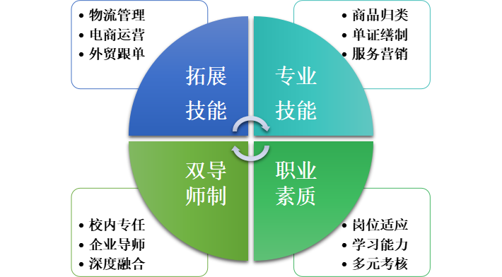 关务与外贸服务专业实施“双导师制、素能一体”的专业人才培养模式。“双导师制”是指校、企共同组建专业教师队伍,共同打造校内外实训基地,以双导师制模式开展专业建设。“素能一体”是指不仅强调培养学生的专业操作技能,还要重视学生的职业素质教育,既要增强毕业生服务经济社会的能力,更要关注学生未来的成长和发展,通过课程过程考核、实训实践等多元化考核不断提升学生的综合职业素质。