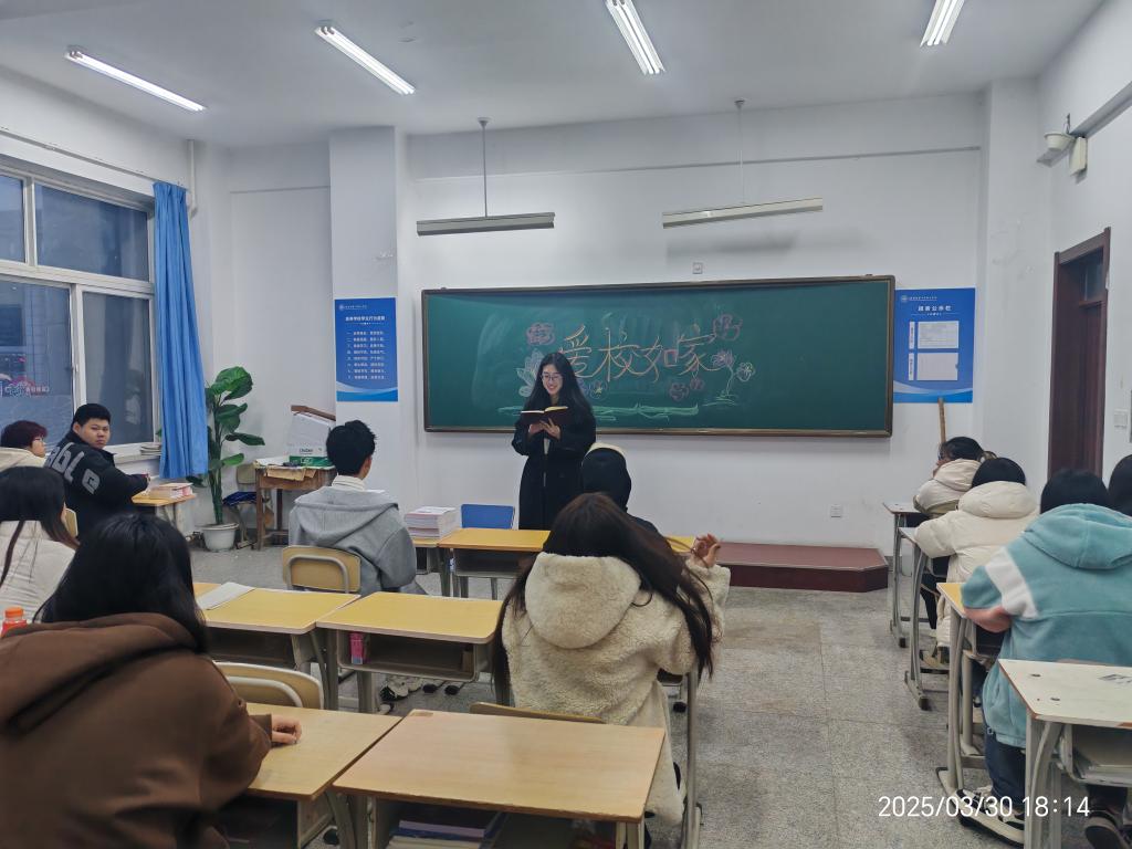郑春岩畅谈校园情怀后,聚焦学风学纪建设,强调学风学纪的建设,号召全体学生以严谨态度学习、以自律精神修身,为个人成长与学校发展筑牢根基。同时结合当前资源系学生学习现状,深入剖析学风建设的重要性。她指出:“爱校不仅体现在情感认同上,更要落实在实际行动中。遵守课堂纪律、严谨治学态度、尊重师长劳动成果,都是对爱校如家最直接的诠释。”她以“按时上课”“按时参加晚自习”“上课认真听讲记笔记”“主动学习英语备考英语A级”呼吁同学们从细节入手,营造良好的校园文化氛围。